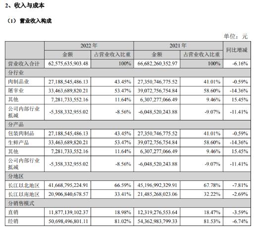 2022年,主要受中外價差收窄、進(jìn)口肉業(yè)務(wù)規(guī)模下降影響,公司肉類產(chǎn)品總外銷量315萬噸,同比下降4.5%;受銷量下降及豬肉價格下降影響,本期實(shí)現(xiàn)營業(yè)總收入627億元,同比下降6.1%;同時,公司積極調(diào)整產(chǎn)品結(jié)構(gòu),有效落實(shí)兩調(diào)一控,較好把控市場行情,科學(xué)運(yùn)作凍品業(yè)務(wù),本期實(shí)現(xiàn)歸屬于上市公司股東的凈利潤56.2億元,同比上升15.5%。