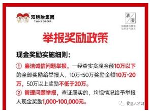 牧原、正邦、京基智農(nóng)等企業(yè)陸續(xù)對(duì)外公布過廉潔告知書,而雙胞胎的舉報(bào)獎(jiǎng)勵(lì)更是驚人。