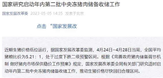 近期生豬價(jià)格低位運(yùn)行,據(jù)國(guó)家發(fā)展改革委監(jiān)測(cè),4月24日~4月28日當(dāng)周,全國(guó)平均豬糧比價(jià)為5.21:1,處于過(guò)度下跌二級(jí)預(yù)警區(qū)間。根據(jù)《完善政府豬肉儲(chǔ)備調(diào)節(jié)機(jī)制 做好豬肉市場(chǎng)保供穩(wěn)價(jià)工作預(yù)案》規(guī)定,國(guó)家發(fā)展改革委會(huì)同有關(guān)部門(mén)研究適時(shí)啟動(dòng)年內(nèi)第二批中央凍豬肉儲(chǔ)備收儲(chǔ)工作,推動(dòng)生豬價(jià)格盡快回歸合理區(qū)間。
