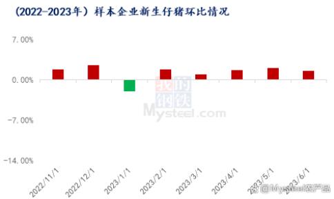 二、2023年新生仔豬同比繼續(xù)增加 從跟蹤企業(yè)數(shù)據(jù)來看,2023年上半年新生仔豬數(shù)量仍然處于較高位水平,除去今年1月份受仔豬腹瀉影響新生仔豬數(shù)量環(huán)比小跌,其余月份均呈現(xiàn)不同程度環(huán)比小增。截止到6月份新生仔豬數(shù)同比去年增加6%以上,在假設(shè)下半年整體商品豬育肥上市率100%前提下 ,今年上半年新生仔豬數(shù)量對應(yīng)到今年下半年整體出欄量仍然較為樂觀。從仔豬維度來看,下半年仍有較多育肥豬需要完成出欄。