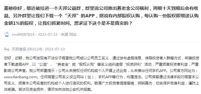 我公司鄭重提示:公司從未授權任何機構或個人開展上述業(yè)務,從未推出任何手機APP。公司官方網址為:www.tianbang.com。任何假冒公司名義設立網站(址)、手機APP等行為,均屬違法。公司保留通過法律手段對假冒本公司名義、損害本公司名譽的機構或個人進行追究的權利。敬請廣大投資者提高警惕,明辨真?zhèn)?,切實保護自身利益,謹防上當受騙。若涉及資金損失,請盡快向當地公安機關報案。