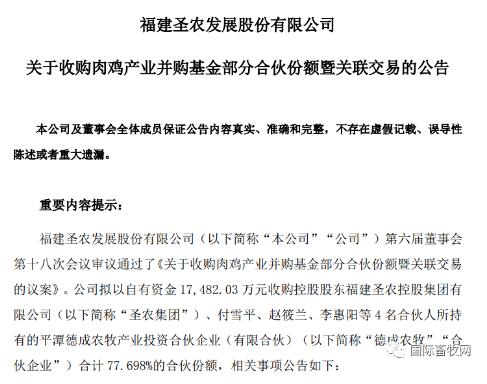 圣農(nóng)發(fā)展今天發(fā)布公告,公司擬以自有資金1.75億元收購控股股東福建圣農(nóng)控股集團(tuán)有限公司(以下簡稱“圣農(nóng)集團(tuán)”)、付雪平、趙筱蘭、李惠陽等4名合伙人所持有的平潭德成農(nóng)牧產(chǎn)業(yè)投資合伙企業(yè)(有限合伙)(以下簡稱“德成農(nóng)牧”“合伙企業(yè)”)合計(jì)77.698%的合伙份額。