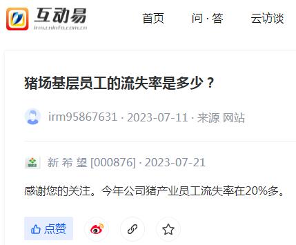 新希望近日在互動平臺上表示,今年公司豬產(chǎn)業(yè)員工流失率在20%多。