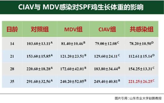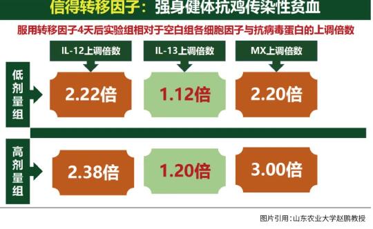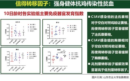 拋開抑制病毒感染而言,信得轉(zhuǎn)移因子對生長性能也有促進作用。實驗中我們發(fā)現(xiàn),使用了高劑量信得轉(zhuǎn)移因子的實驗組雞群,即便有傳貧感染體重仍然能夠接近正常SPF雞的水平。