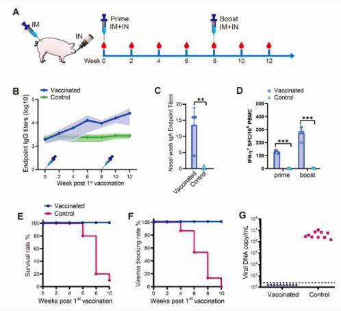 近日,中國科學(xué)院廣州生物醫(yī)藥與健康研究院和廣州實驗室等,在腺病毒載體非洲豬瘟疫苗研制及免疫策略研究方面取得新進展。相關(guān)研究成果以A new vaccination regimen using adenovirus-vectored vaccine confers effective protection against African swine fever virus in swine為題,在線發(fā)表在《新興微生物與感染》(Emerging Microbes & Infections)上。?