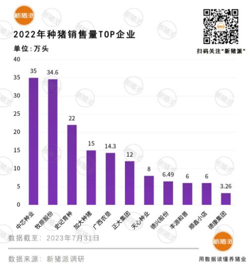 根據(jù)新豬派調(diào)研,2022年種豬銷售TOP10企業(yè)分別是中芯種業(yè)、牧原、史記、加大、廣西農(nóng)墾、正大等企業(yè),合計(jì)銷量為162.65萬(wàn)頭。