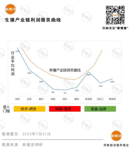 根據(jù)統(tǒng)計(jì)測(cè)算,生豬產(chǎn)業(yè)鏈行業(yè)平均利潤(rùn)最高的是育種,高達(dá)55%;屬于產(chǎn)業(yè)鏈利潤(rùn)微笑曲線的頂端。做好育種則需要技術(shù)與長(zhǎng)期研發(fā)經(jīng)費(fèi)的支撐,可不是一蹴而就。
