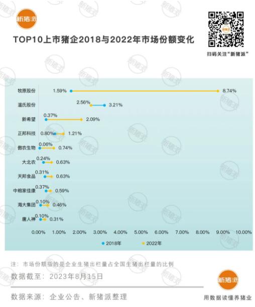 首先是市場(chǎng)份額,即企業(yè)出欄量占全國(guó)出欄總量的比重。2022年,10家企業(yè)合計(jì)出欄生豬1.26億頭,在過去的5年里市場(chǎng)份額由7%提高至18%。其中除溫氏下滑外,另外9家的市場(chǎng)份額均有提升,以牧原最為明顯,其出欄量由2018年的1101萬頭到2022年的6120萬頭,暴漲了4.6倍,已經(jīng)占到全國(guó)的8.7%。