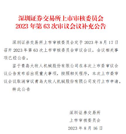 8月17日,本是青島大牧人機械股份有限公司(以下簡稱“大牧人”)迎來深交所主板首發(fā)上會的日子,然而,在8月16日晚間,深交所上市委突然發(fā)布補充公告,稱鑒于大牧人在本次上市委審議會議公告發(fā)布后出現(xiàn)重大事項,按照相關(guān)程序,定于8月17日的上市委審議會議取消審議大牧人發(fā)行上市申請。關(guān)于重大事項是什么,公告中并未披露。