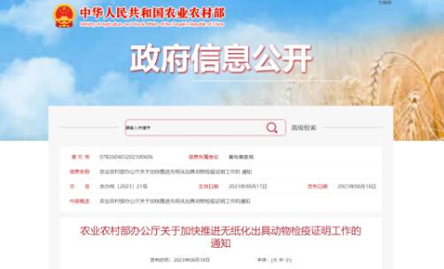 農(nóng)業(yè)農(nóng)村部辦公廳關(guān)于加快推進(jìn)無紙化出具動物檢疫證明工作的通知