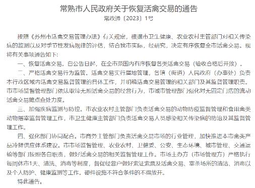 近日,江蘇常熟市人民政府發(fā)布通告,即日起恢復(fù)活禽交易!