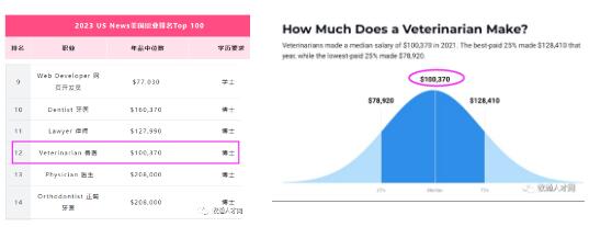 2023美國最佳職業(yè)排行榜Top100中,獸醫(yī)排第12名!美國勞工統(tǒng)計(jì)局預(yù)測,2021年至2031年期間,獸醫(yī)的就業(yè)增長率為19.4%,在此期間,估計(jì)有16800個(gè)工作崗位。