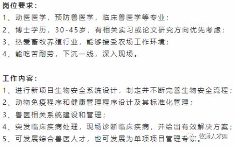 唐人神目前在廣東、云南招聘大區(qū)獸醫(yī)總監(jiān),要求相關(guān)崗位工作經(jīng)驗(yàn)4年以上,學(xué)歷本科,月薪2萬+,而同公司同崗位,能達(dá)到碩士及以上學(xué)歷且有5年以上獸醫(yī)技術(shù)管理經(jīng)驗(yàn)者,月薪3萬+;