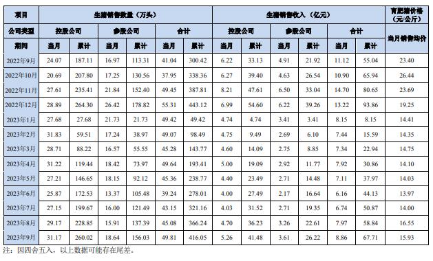 公司控股及參股公司銷售情況如下:1、2023年9月控股公司生豬銷售數(shù)量為31.17萬頭,銷售收入5.26億元。其中銷售數(shù)量環(huán)比增長6.86%,同比增長29.50%;銷售收入環(huán)比增長11.91%,同比增長-15.43%;商品肥豬出欄均重116.16公斤,銷售均價15.87元/公斤。