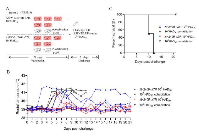 非洲豬瘟是由非洲豬瘟病毒引起的一種急性、高致死性傳染病,給世界養(yǎng)豬業(yè)造成了嚴(yán)重的經(jīng)濟(jì)損失。由于病毒的致病機(jī)制不清楚,而且缺乏安全、高效的疫苗和特效藥物,非洲豬瘟的防控形勢(shì)依然嚴(yán)峻。哈獸研相關(guān)團(tuán)隊(duì)在前期鑒定好的兩個(gè)與非洲豬瘟病毒致病力密切相關(guān)的基因MGF505-7R(PLoS Pathog,2021)和H240R(J Virol,2023)基礎(chǔ)上,本研究以非洲豬瘟病毒HLJ/18為親本株,同時(shí)敲除H240R和MGF505-7R基因,獲得一個(gè)雙基因缺失毒株(ASFV-ΔH240R-Δ7R)。