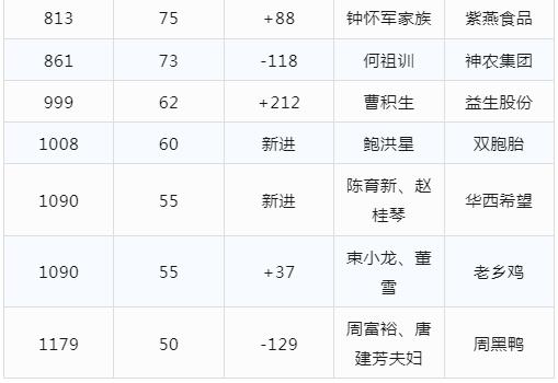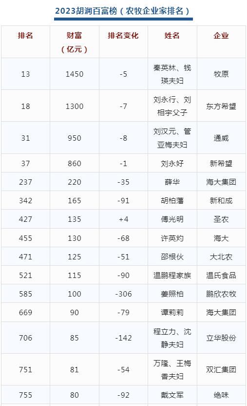 秦英林夫婦、劉永行父子、劉漢元夫婦、薛華、邵根伙、程立力夫婦等22家農(nóng)牧企業(yè)家入圍。此次榜單,豬肉、飼料等企業(yè)家財(cái)富均在下滑,而家禽行業(yè)表現(xiàn)搶眼,其中益生股份曹積生排名上浮212漲幅最大。雙胞胎集團(tuán)鮑洪星、華西希望陳育新、趙桂琴等兩家企業(yè)新進(jìn)此榜單。