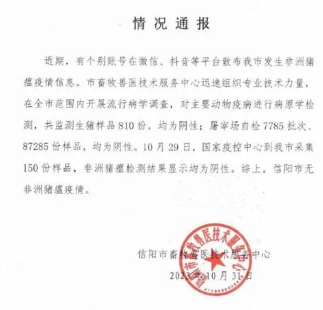 市畜牧獸醫(yī)技術(shù)服務中心迅速組織專業(yè)技術(shù)力量,在全市范圍內(nèi)開展流行病學調(diào)查,對主要動物疫病進行病原學檢測,共監(jiān)測生豬樣品810份,均為陰性;屠宰場自檢7785批次、87285份樣品,均為陰性。10月29日,國家疫控中心到我市采集150份樣品,非洲豬瘟檢測結(jié)果顯示均為陰性。綜上, 信陽市無非洲豬瘟疫情。