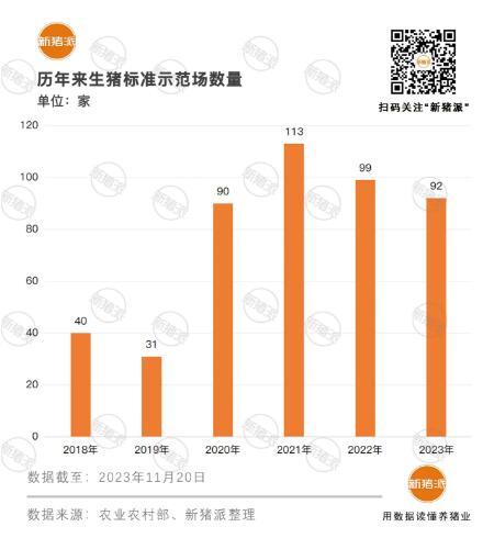 2018年開啟畜禽養(yǎng)殖標準化示范場新標準以來,生豬示范場每年的數(shù)量經(jīng)歷了快速增長期,2021年達到峰值113家,此后開始平穩(wěn)下降,生豬示范場在總數(shù)中占比穩(wěn)定在48%。