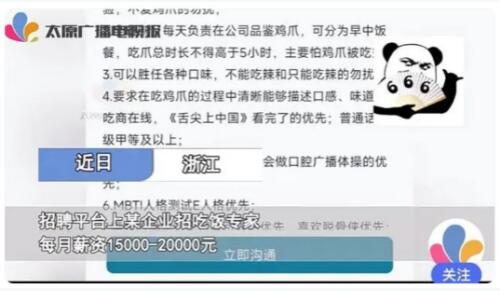近日,某社交媒體上一則招聘啟事的截圖引起關(guān)注。根據(jù)截圖顯示,該食品公司開出月薪1.5萬到2萬元,招聘“吃飯專家”。職位要求:至少有5年吃雞爪的經(jīng)驗,每天負責(zé)在公司品鑒雞爪,可以勝任各種口味,吃雞爪總時長不得高于5小時。