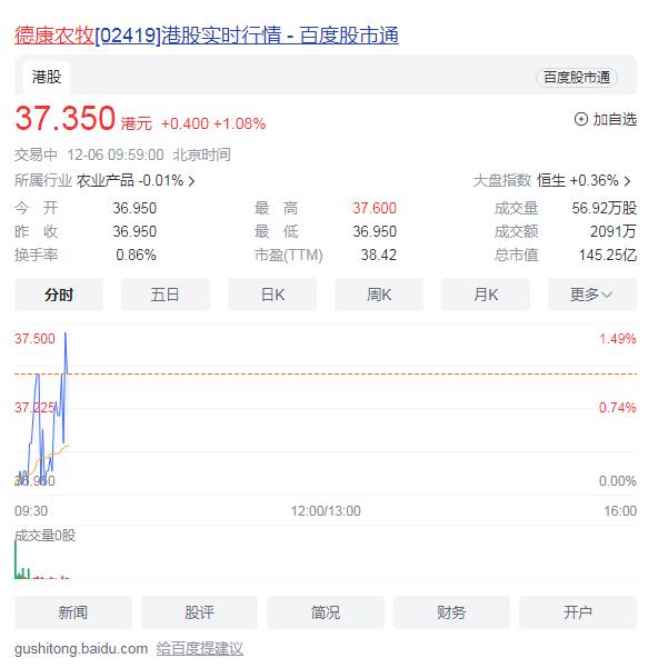 截至9:59,德康農(nóng)牧漲1.08%,報37.35港元每股,總市值145.25億港元。