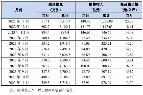 2023年11月份,公司銷售生豬529.5萬頭(其中商品豬528.1萬頭,仔豬0.2萬頭,種豬1.1萬頭),銷售收入87.91億元。其中向全資子公司牧原肉食品有限公司及其子公司合計(jì)銷售生豬136.6萬頭。