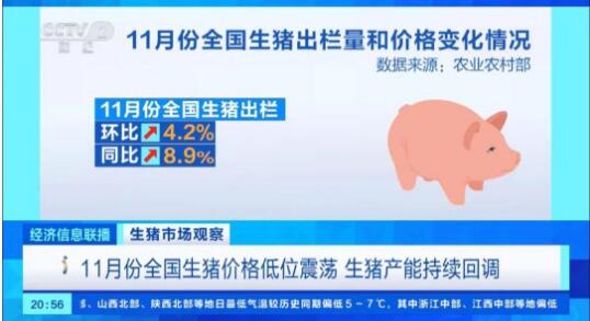 據(jù)農(nóng)業(yè)農(nóng)村部監(jiān)測(cè),11月份至12月中旬,全國豬肉消費(fèi)增長(zhǎng)較為緩慢,受入冬前期天氣偏暖影響,南方腌臘灌腸的數(shù)量比較常年明顯下降,滯后于同期的豬肉供應(yīng)量的增長(zhǎng),生豬價(jià)格低位震蕩運(yùn)行。11月份,全國生豬出欄環(huán)比增長(zhǎng)4.2%、同比增長(zhǎng)8.9%;