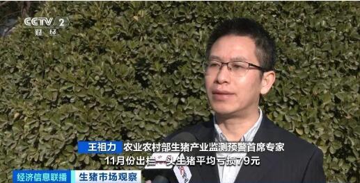 農(nóng)業(yè)農(nóng)村部生豬產(chǎn)業(yè)監(jiān)測(cè)預(yù)警首席專家 王祖力:據(jù)測(cè)算,11月份,出欄一頭生豬平均虧損79元。按照加權(quán)平均計(jì)算,今年1到11月份出欄一頭生豬平均虧損73元,今年或是2014年以來,首個(gè)算總賬全年虧損的年份。