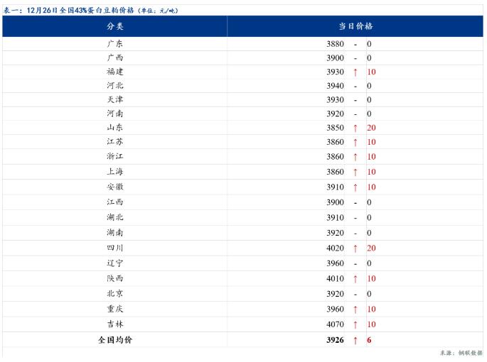 12月26日油廠豆粕報(bào)價(jià)穩(wěn)中上調(diào),其中沿海區(qū)域油廠主流報(bào)價(jià)在3850-3930元/噸,廣東3880元/噸穩(wěn)定,江蘇3860漲10元/噸,山東3850漲20元/噸,天津3930元/噸穩(wěn)定。