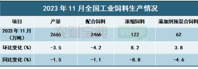 1、11月份飼料產(chǎn)量呈下降趨勢(shì) 據(jù)樣本企業(yè)數(shù)據(jù)測(cè)算,2023年11月,全國(guó)工業(yè)飼料產(chǎn)量2665萬噸,環(huán)比下降3.5%,同比下降1.5%。主要配合飼料、濃縮飼料、添加劑預(yù)混合飼料產(chǎn)品出廠價(jià)格環(huán)比、同比均呈下降趨勢(shì)。