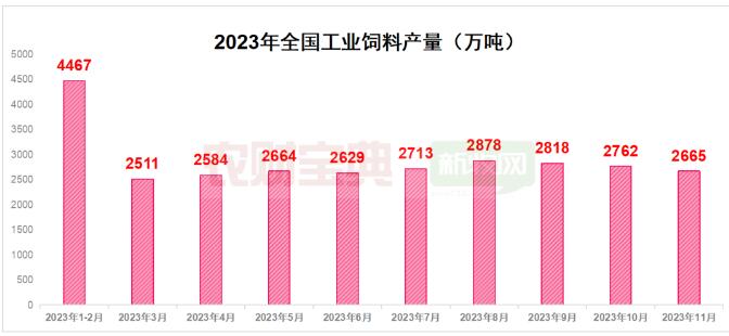2023年12月26日,農(nóng)業(yè)農(nóng)村部畜牧獸醫(yī)局、中國(guó)飼料工業(yè)協(xié)會(huì)共同發(fā)布《2023年11月份全國(guó)飼料生產(chǎn)形勢(shì)》。今年前11月全國(guó)工業(yè)飼料產(chǎn)量達(dá)2.869億噸,同比增長(zhǎng)4.0%。