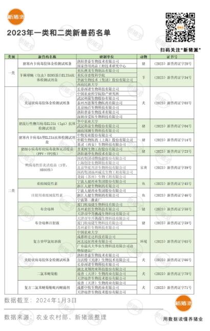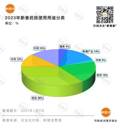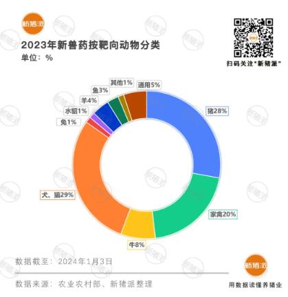 據(jù)新豬派統(tǒng)計(jì),疫苗產(chǎn)品依然是主要新藥方向,2023年疫苗產(chǎn)品占比36%;檢測(cè)類和激素類占比稍有下降,分別占比14%和4%;由于寵物外用藥和中藥劑的數(shù)量有所增長(zhǎng),體外用藥占比13%,包括耳用滴劑、皮膚用藥及驅(qū)蟲滴劑等,中藥占比回升至12%。