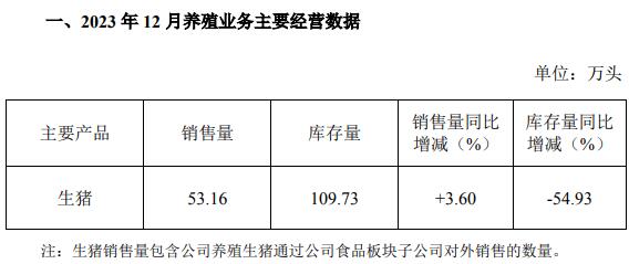 2023年1-12月,公司累計銷售生豬585.90萬頭,銷售量同比增長12.91%。