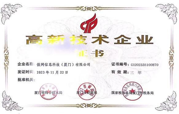 日前,根據(jù)《高新技術(shù)企業(yè)認定管理辦法》(國科發(fā)火〔2016〕32號)和《高新技術(shù)企業(yè)認定管理工作指引》(國科發(fā)火〔2016〕195號)有關(guān)規(guī)定,廈門市認定機構(gòu)對2023年認定報備的第一批871家高新技術(shù)企業(yè)備案名單予以公告,傲網(wǎng)信息科技(廈門)有限公司(以下簡稱:傲網(wǎng)信息科技)通過了國家高新技術(shù)企業(yè)重新認定,此次“國字號”榮譽在傲網(wǎng)信息科技的成功延續(xù),意味著傲網(wǎng)信息科技在研發(fā)創(chuàng)新等方面的實力得到了社會各界的持續(xù)性高度認可。