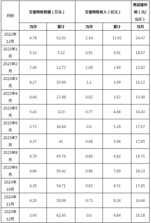 2023年1-12月,公司共銷售生豬62.45萬頭,生豬銷售收入9.84億元,商品豬銷售均價17.13元/公斤,同比變動分別為20.03%、-15.22%、-27.99%。