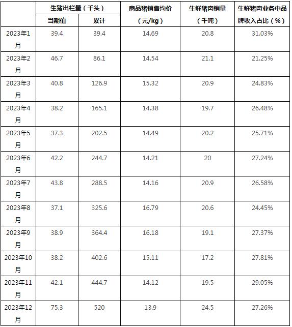 中糧家佳康1月10日公布2023年12月運(yùn)營(yíng)快報(bào)。公司12月生豬出欄量75.3萬(wàn)頭;商品豬銷(xiāo)售均價(jià)13.9元/公斤;生鮮豬肉銷(xiāo)量2.45萬(wàn)噸;生鮮豬肉業(yè)務(wù)中品牌收入占比27.26%。于2023年1-12月,生豬出欄量520萬(wàn)頭,同比增加26.74%。