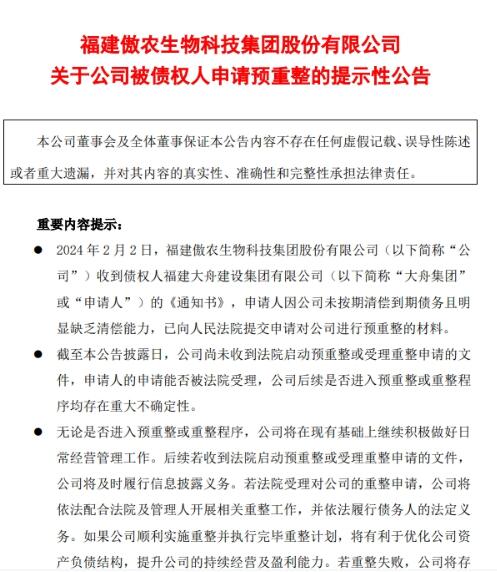 公告表示,無(wú)論是否進(jìn)入預(yù)重整或重整程序,傲農(nóng)生物將在現(xiàn)有基礎(chǔ)上繼續(xù)積極做好日常經(jīng)營(yíng)管理工作。后續(xù)若收到法院?jiǎn)?dòng)預(yù)重整或受理重整申請(qǐng)的文件,公司將及時(shí)履行信息披露義務(wù)。若法院受理對(duì)公司的重整申請(qǐng),公司將依法配合法院及管理人開(kāi)展相關(guān)重整工作,并依法履行債務(wù)人的法定義務(wù)。如果公司順利實(shí)施重整并執(zhí)行完畢重整計(jì)劃,將有利于優(yōu)化公司資產(chǎn)負(fù)債結(jié)構(gòu),提升公司的持續(xù)經(jīng)營(yíng)及盈利能力。若重整失敗,公司將存在被宣告破產(chǎn)的風(fēng)險(xiǎn)。如果公司被宣告破產(chǎn),根據(jù)相關(guān)規(guī)定,公司股票將面臨被終止上市的風(fēng)險(xiǎn),敬請(qǐng)廣大投資者注意投資風(fēng)險(xiǎn)。
