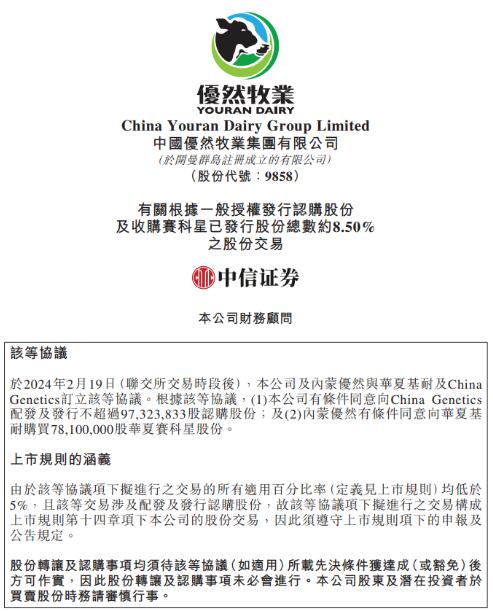 根據(jù)該等協(xié)議,(1)該公司有條件同意向China Genetics 配發(fā)及發(fā)行不超過約9732.38萬股認(rèn)購(gòu)股份,認(rèn)購(gòu)價(jià)每股人民幣1.45元,較于認(rèn)購(gòu)協(xié)議日期在聯(lián)交所所報(bào)收市價(jià)每股1.21港元溢價(jià)約32.23%,最高認(rèn)購(gòu)代價(jià)總額為約人民幣1.41億元;及(2)內(nèi)蒙優(yōu)然有條件同意向華夏基耐購(gòu)買7810萬股華夏賽科星股份,每股華夏賽科星股份人民幣1.83元,總代價(jià)約人民幣1.43億元。