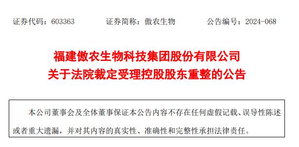 3月7日,傲農(nóng)生物發(fā)布公告,福建省漳州市薌城區(qū)人民法院于2024年3月7日裁定受理債權(quán)人福建大舟建設(shè)集團(tuán)有限公司對福建傲農(nóng)生物科技集團(tuán)股份有限公司控股股東漳州傲農(nóng)投資有限公司的重整申請。