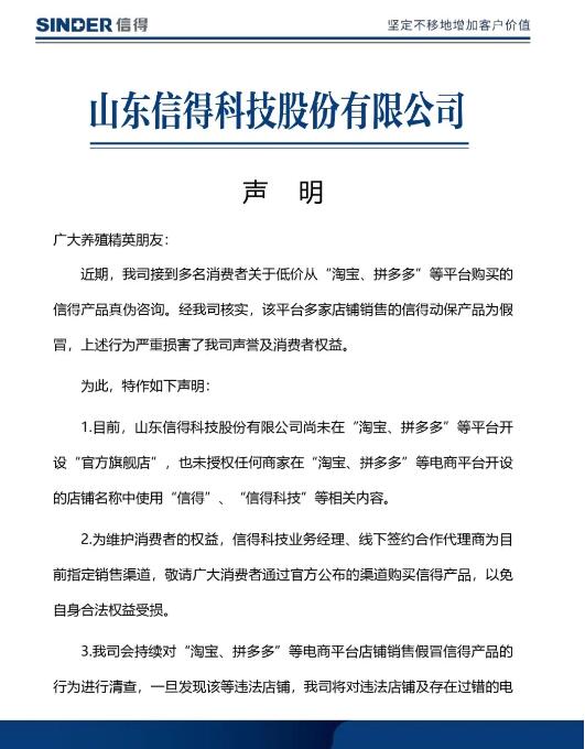 針對(duì)近日網(wǎng)上多家店鋪假冒公司名義銷售動(dòng)保產(chǎn)品一事,3月14日,信得科技發(fā)布聲明,目前,公司尚未在“淘寶、拼多多”等平臺(tái)開設(shè)“官方旗艦店”,也未授權(quán)任何商家在上述平臺(tái)開設(shè)的店鋪名稱中使用“信得”、“信得科技”等相關(guān)內(nèi)容,請(qǐng)廣大消費(fèi)者認(rèn)準(zhǔn)公司指定銷售渠道。