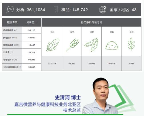 嘉吉2023年全球霉菌毒素報告,是嘉吉經(jīng)過收集、整理和分析覆蓋全球43個國家的原料樣品、基于嘉吉全球?qū)嶒炇业?6萬多次原料樣品檢測分析、按照嘉吉的霉菌毒素風(fēng)險閾值*進行評價而形成。其中,有約8.5萬份針對中國,這可能是全球和中國的最大數(shù)據(jù)庫。年度報告還新增了飼草數(shù)據(jù),這對于了解反芻動物霉菌毒素風(fēng)險尤為重要。