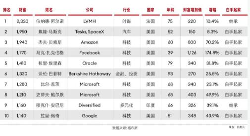 除人數(shù)外,上榜富豪的財富總額也刷新了歷史記錄,達到14.2萬億美元,較2023年榜單增長2萬億美元,較此前2021年的記錄增長1.1萬億美元。榜單的前20名表現(xiàn)尤為亮眼,其財富總額在過去12個月中增長了7,000億美元。