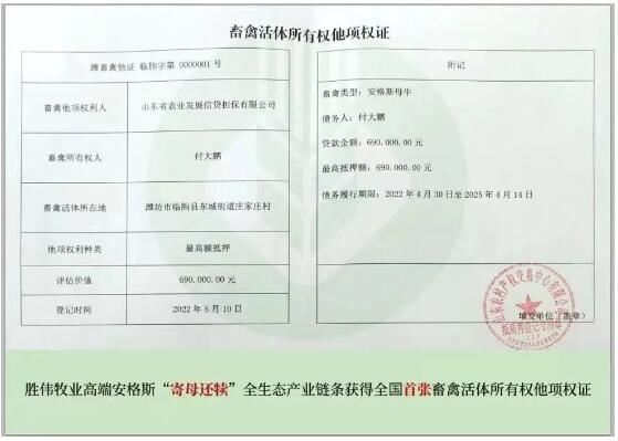 勝偉在全國(guó)范圍內(nèi)創(chuàng)造了首張《畜禽活體所有權(quán)他項(xiàng)權(quán)證》,完成肉牛真正意義上的活體抵押,實(shí)現(xiàn)活體生物數(shù)字化、數(shù)字資產(chǎn)化、資產(chǎn)金融化、金融證券化,打破了千百年來(lái)“家有萬(wàn)貫帶毛的不算”的傳統(tǒng)觀念,具有劃時(shí)代的意義。
