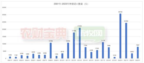 實(shí)際上,非瘟后我國從國外進(jìn)口種豬數(shù)量并不少,但引種回來后是否真的在育種,又能否維持種豬健康狀況,是對(duì)企業(yè)人才團(tuán)隊(duì)、資金實(shí)力等多方面的考驗(yàn)。據(jù)《農(nóng)財(cái)寶典》新牧網(wǎng)記者統(tǒng)計(jì),2018年我國暴發(fā)非瘟后,次年種豬進(jìn)口量驟降。2020-2021年是種豬進(jìn)口的井噴期,兩年進(jìn)口5萬多頭,遠(yuǎn)高于常年需求。2023年國內(nèi)引種進(jìn)口種豬7997頭。