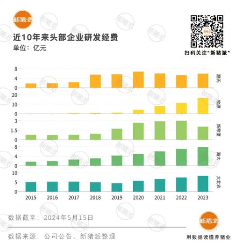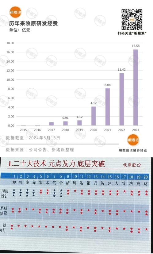 2023年牧原研發(fā)投入共計16.58億元,主要用于解決掣肘生產(chǎn)的各種難題。從種、料、康、養(yǎng)等20大技術(shù)頂層設(shè)計,實現(xiàn)底層元點突破。根據(jù)新豬派統(tǒng)計,牧原自2015年以來,投入研發(fā)共計43億元。