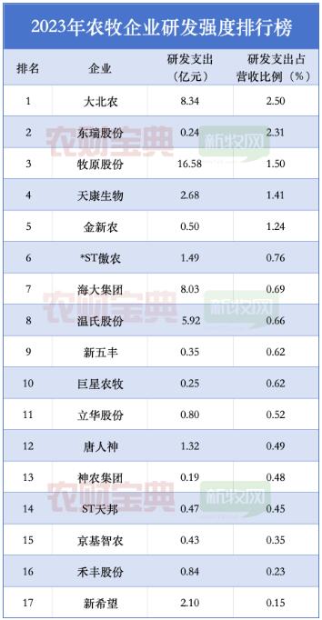 據《農財寶典》新牧網記者不完全統(tǒng)計,國內17家農牧企業(yè)2023年研發(fā)費用超50億元。牧原股份、大北農、海大集團、溫氏股份、天康生物、新希望、*ST傲農、唐人神,這8家企業(yè)2023年研發(fā)經費超億元,分別是16.58億元、8.34億元、5.92億元、2.68 億元、2.10億元、1.49億元、1.32億元。