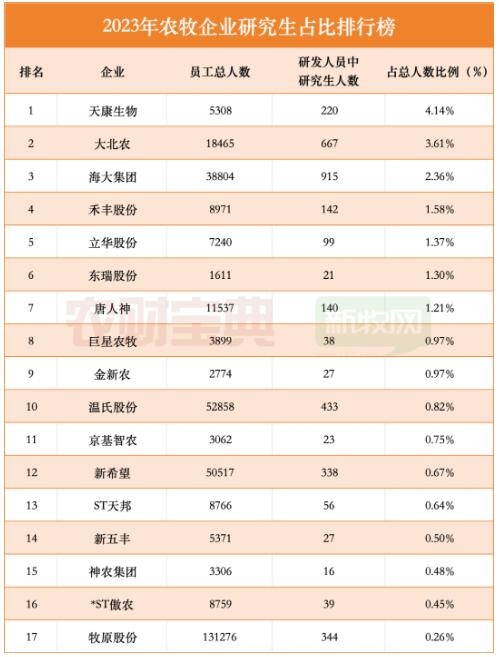 從研發(fā)強度來看,大北農居首位,其研發(fā)金額占總營收比例的2.5%;其次是東瑞股份(占比2.31%)、牧原股份(占比1.5%)。從人才結構來看,天康生物更勝一籌,其研究生人數(shù)占公司總人數(shù)4.14%,其次是大北農、海大集團。