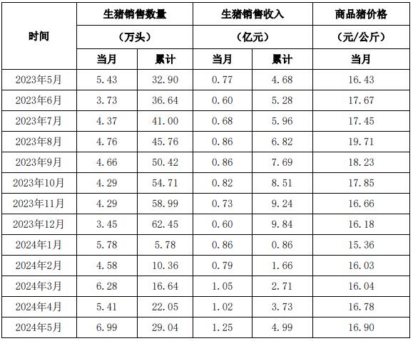 東瑞股份6月6日公布2024年5月份生豬銷售簡(jiǎn)報(bào)。2024年5月份,公司共銷售生豬6.99萬(wàn)頭,銷售收入1.25億元,環(huán)比上升22.72%;商品豬銷售均價(jià)16.90元/公斤,環(huán)比上升0.74%。其中向全資子公司河源市東瑞肉類食品有限公司銷售生豬0.42萬(wàn)頭。