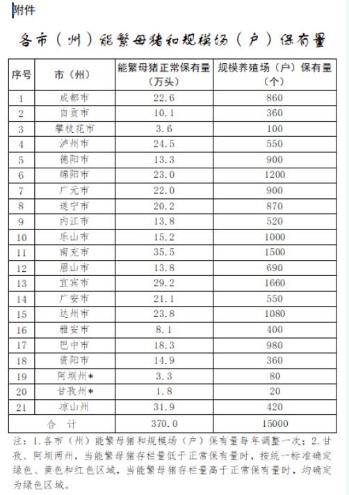 按照農(nóng)業(yè)農(nóng)村部《生豬產(chǎn)能調(diào)控實(shí)施方案(2024年修訂)》要求,結(jié)合《四川省“十四五”推進(jìn)農(nóng)業(yè)農(nóng)村現(xiàn)代化規(guī)劃》,設(shè)定四川省能繁母豬存欄量調(diào)控目標(biāo)穩(wěn)定在正常保有量370萬頭左右。結(jié)合各市(州)產(chǎn)業(yè)發(fā)展布局重點(diǎn),確定能繁母豬正常保有量(附件1)。各市(州)能繁母豬月度存欄量以國家統(tǒng)計(jì)局季度數(shù)據(jù)為基數(shù),根據(jù)農(nóng)業(yè)農(nóng)村部養(yǎng)殖場直聯(lián)直報(bào)系統(tǒng)監(jiān)測數(shù)據(jù)測算得出。(農(nóng)業(yè)農(nóng)村廳負(fù)責(zé))