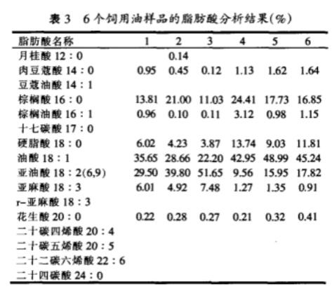 表3為我們近期分析測定的飼用油脂樣品的脂肪酸組成,以往的分析工作中,曾多次發(fā)現(xiàn)在飼用油脂中摻入非食用油,特別是礦物油,但隨著礦物油價格的提高,這類摻假現(xiàn)象已逐漸少見。1~3號為標(biāo)示豆油的樣品,從其脂肪酸結(jié)構(gòu)分析結(jié)果看,3號樣具有典型大豆油的脂肪酸結(jié)構(gòu),而2號樣品應(yīng)疑似摻入了棕櫚油,1號樣品具有摻入了一部分餐館回收油的可能。4~6號為標(biāo)示豬油的樣品,4號樣品具有典型豬油的脂肪酸結(jié)構(gòu),5號和6號樣品無論從其脂肪酸結(jié)構(gòu)上看還是從其外在形態(tài)和低溫試驗結(jié)果看均不是純凈的豬油,而很可能是價值更低的餐館回收油。在實際分析中還可以利用表2中所示的各種不同油脂的理化指標(biāo)如碘價、脂肪凝固點等指標(biāo)進(jìn)行進(jìn)一步佐證。