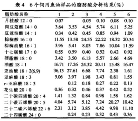 與豬油等飼用油脂價格較低不同,魚油是市場售價較高的油脂品種。因此,魚油中摻入低價動物油、植物油或餐館回收油的現(xiàn)象更為常見。表4為6個飼用魚油樣品的脂肪酸分析結(jié)果,通過分析它們的脂肪酸構(gòu)成,并與表1中不同油脂的典型脂肪酸組成相比較,5、6號樣品中二十碳五烯酸和二十二碳六烯酸含量總和均超過20%,具有典型的魚油的脂肪酸結(jié)構(gòu),可以證明它們均為貨真價實的魚油。1、2號樣品不具有典型的魚油脂肪酸結(jié)構(gòu),它們含有特別高的亞油酸,極有可能是摻入了較多的植物油如豆油或棉籽油等所致。而 3、4號樣品正好相反,亞油酸卻特別低,同時其棕櫚酸和油酸又較高,因此我們判斷這兩個樣品中有可能摻入了部分餐館回收油,因為餐館回收油通常以豬、反芻動物和禽類脂肪為主其它植物油為輔的混合油,其中的棕櫚酸和油酸含量較高(可參見表1)。當(dāng)然摻入棕櫚油也能帶來類似的脂肪酸結(jié)構(gòu)的變化,但摻入棕櫚油會明顯提高凝固點,因此通常不會出現(xiàn)在魚油中摻入棕櫚油這種情況。在實際分析中還可以利用表2中所示的各種不同油脂的理化指標(biāo)如碘價、脂肪凝固點等指標(biāo)進(jìn)行進(jìn)一步佐證。
